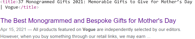 我们在“便宜”、“官方”和“2021”等营销术语中看到了一些类似的模式。不过,这里是踢球者:在某些情况下,Google 会采用不带最高级的 <title> 标记并将它们添加回来。例如: