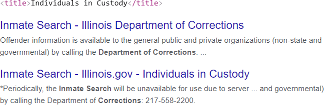 第一个结果出现在“惩教署”的搜索中,第二个结果出现在“监狱犯人搜索”的搜索中。虽然乍一看这似乎很有趣,但这些结果是在两个不同的位置(可能还有两个不同的数据中心)收集的。当我试图从一个位置重现这种差异时,我只得到了一个(重写的)显示标题。