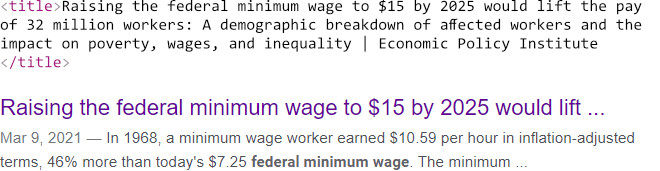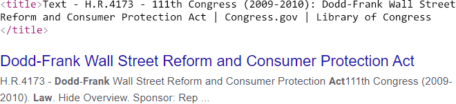 该文本实际上出现在 <title> 标记的中间,但它可能是从目标页面的其他位置提取的。我认为这是服务于搜索查询(在本例中为“Dodd Frank”)的非常成功的截断。