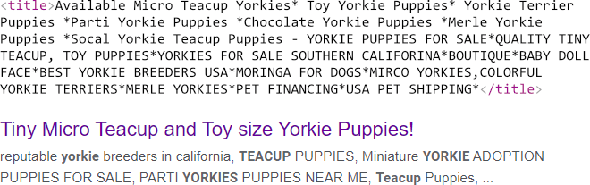 谷歌只能在一行中容纳这么多。多年来,这一限制发生了变化,但基本事实仍然存在。在许多情况下,<title> 标签太长了,这并不总是一件坏事,也不一定是垃圾邮件。这是一个示例及其相应的搜索结果: