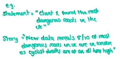 现在,为了让这件事变得切实可行,以便您能够理解我在说什么,我有一个声明与故事的示例,用于我们最近为我们的汽车客户所做的活动。所以这是我的声明示例。“客户 X 发现英国最危险的道路是 X、Y、Z。” 这就是声明。现在,对于这个故事,让我们稍微调剂一下。“新数据显示,英国 10 条最危险的道路中有 8 条位于伦敦,因为骑自行车的人死亡人数创下历史新高。”