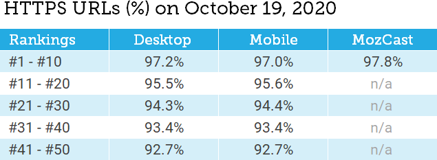 排名靠前的 HTTPS 普及率增加是否表明 HTTPS 是一个排名因素?不是单独的——更有权威的网站可能对感知的安全性更敏感,并且有更多的预算来实施它。然而,我们知道谷歌已经公开表示 HTTPS 是一种“轻量级排名信号”,而这些数据似乎支持了这一说法。
