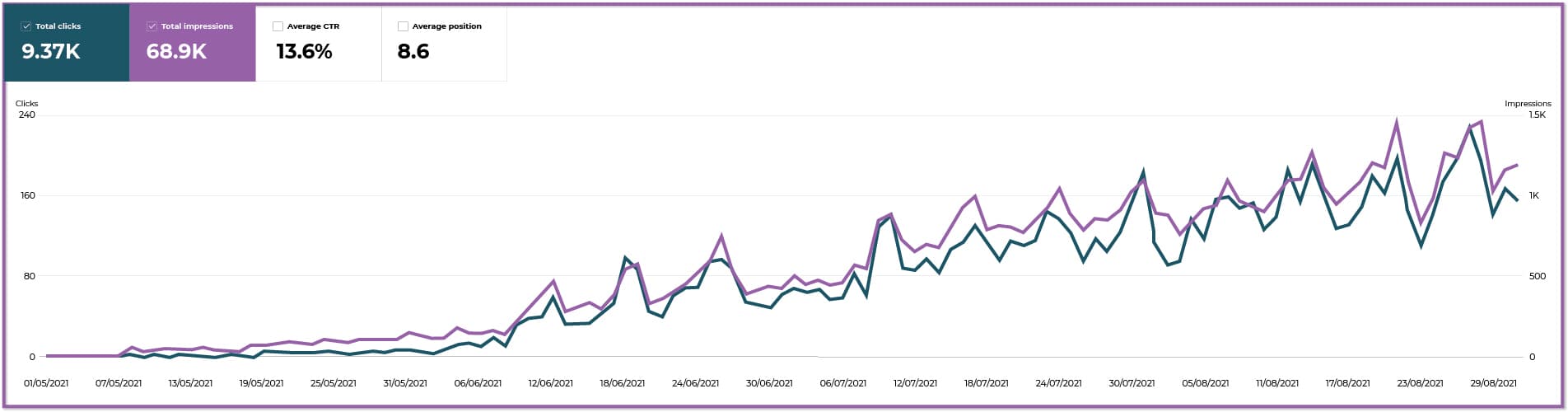 关键字聚类功能强大。下图显示了一篇文章在 Google SERP 中的历程。它对 50 个聚类关键字进行排名,并包括来自 PAA 的问题。这篇文章很快就实现了精选片段、图片排名、9.37k 次点击、68.9k 次展示、13.6% CTR 和平均在页面上停留的 6 分钟。哦,这是在单个网站直接反向链接到文章之前实现的。
