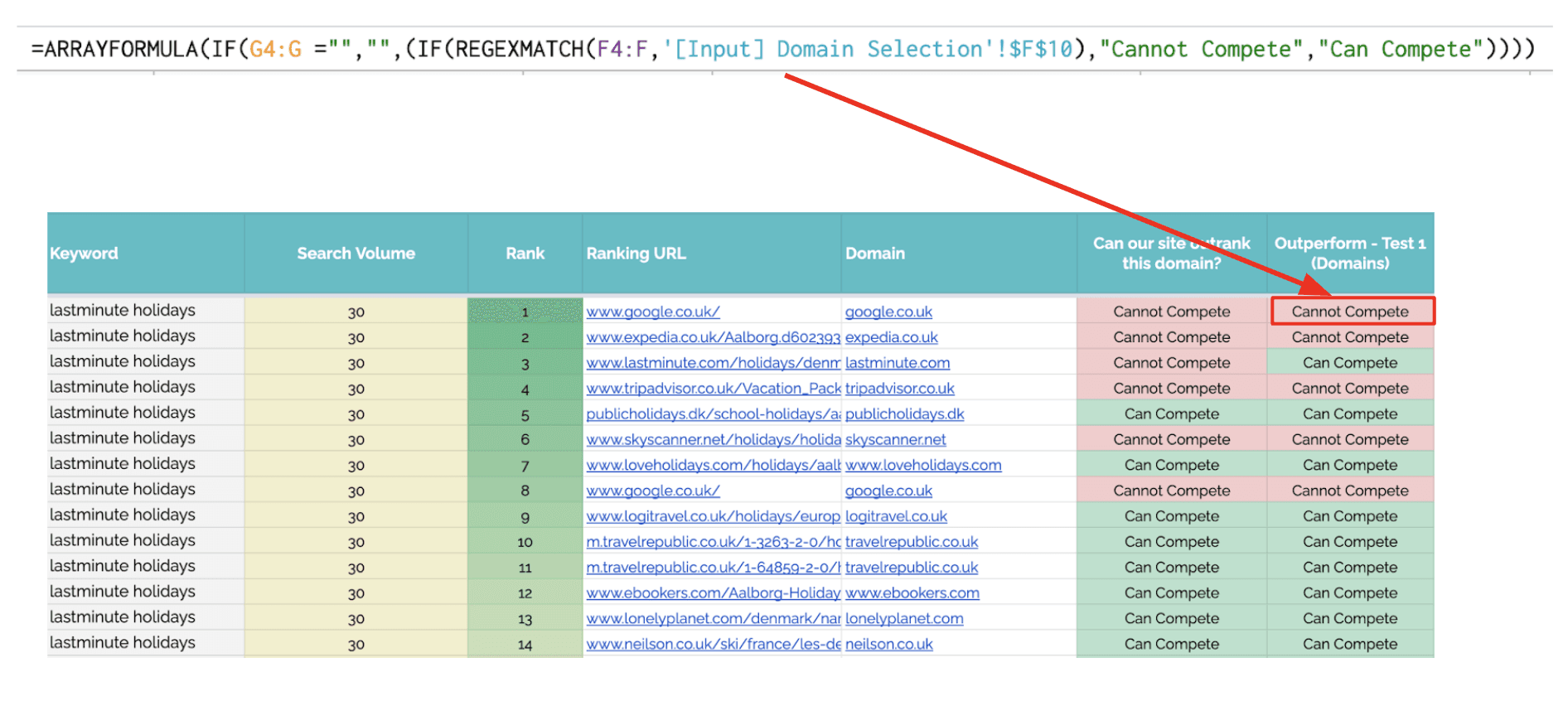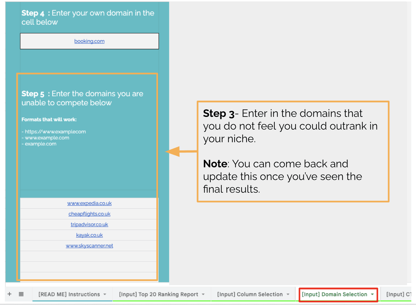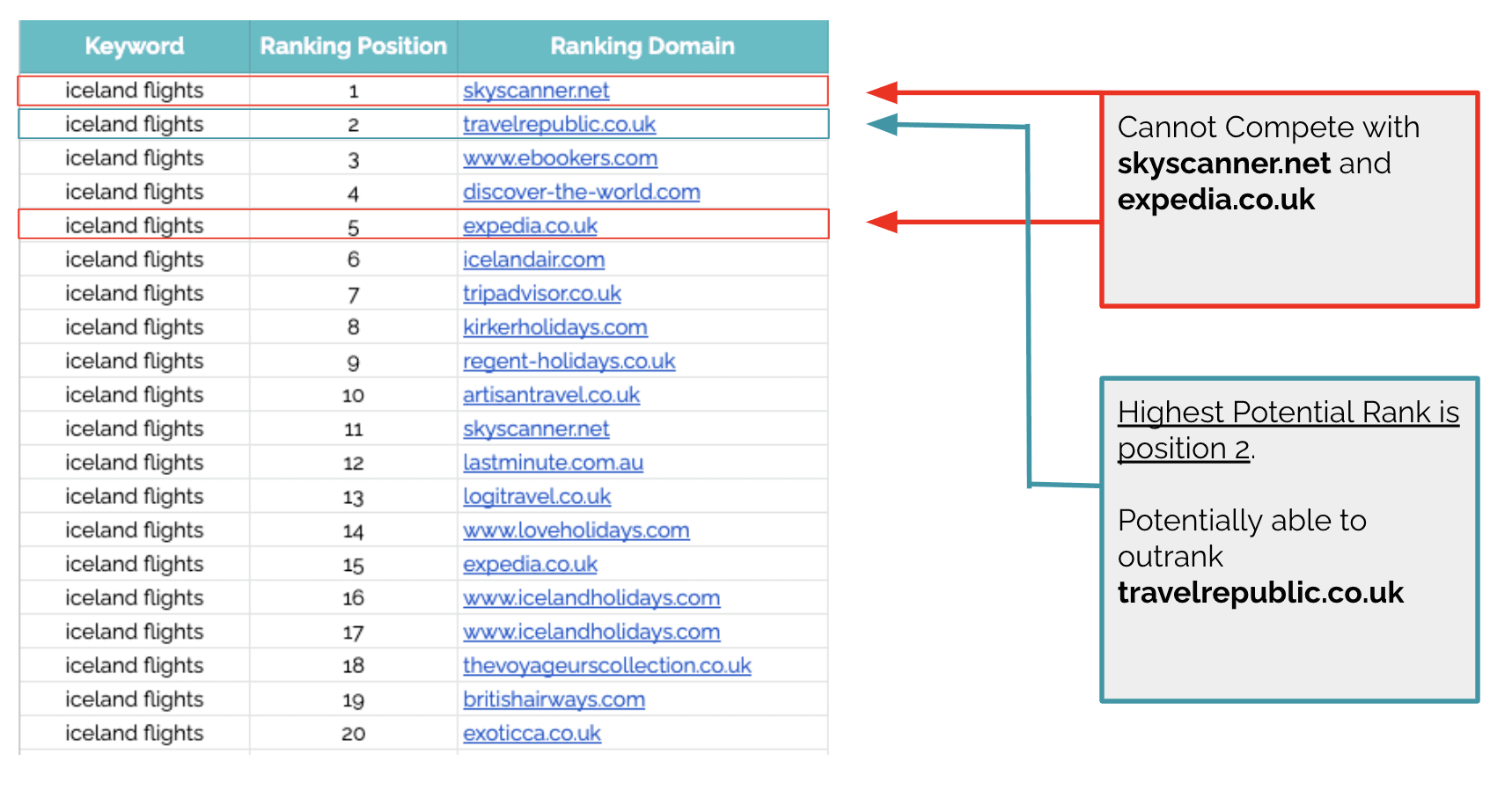 您知道您可能可以对相当多的“航班”术语进行排名,除非有像 expedia.com 这样的比较网站已经排名。因此,您将 expedia.com 添加为要删除的域,现在工作表将为每个关键字找到您可以获得的最佳排名,除了 Expedia 已经出现的位置。