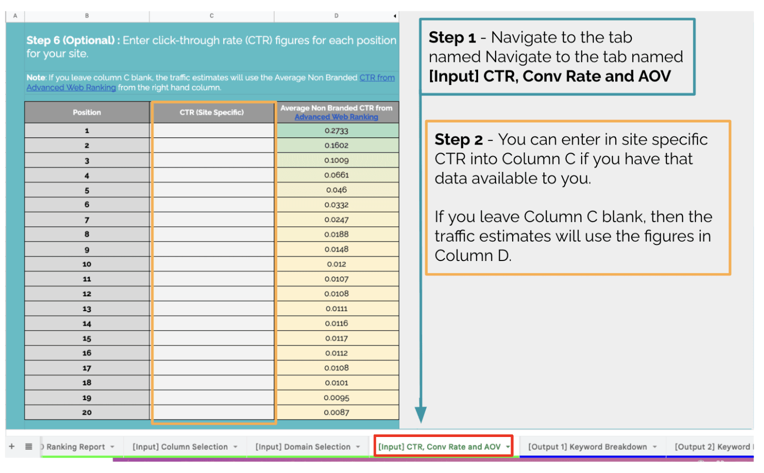 注意:如果您将此列留空,则流量估算将使用 Advanced Web Rankings 中的平均非品牌点击率。