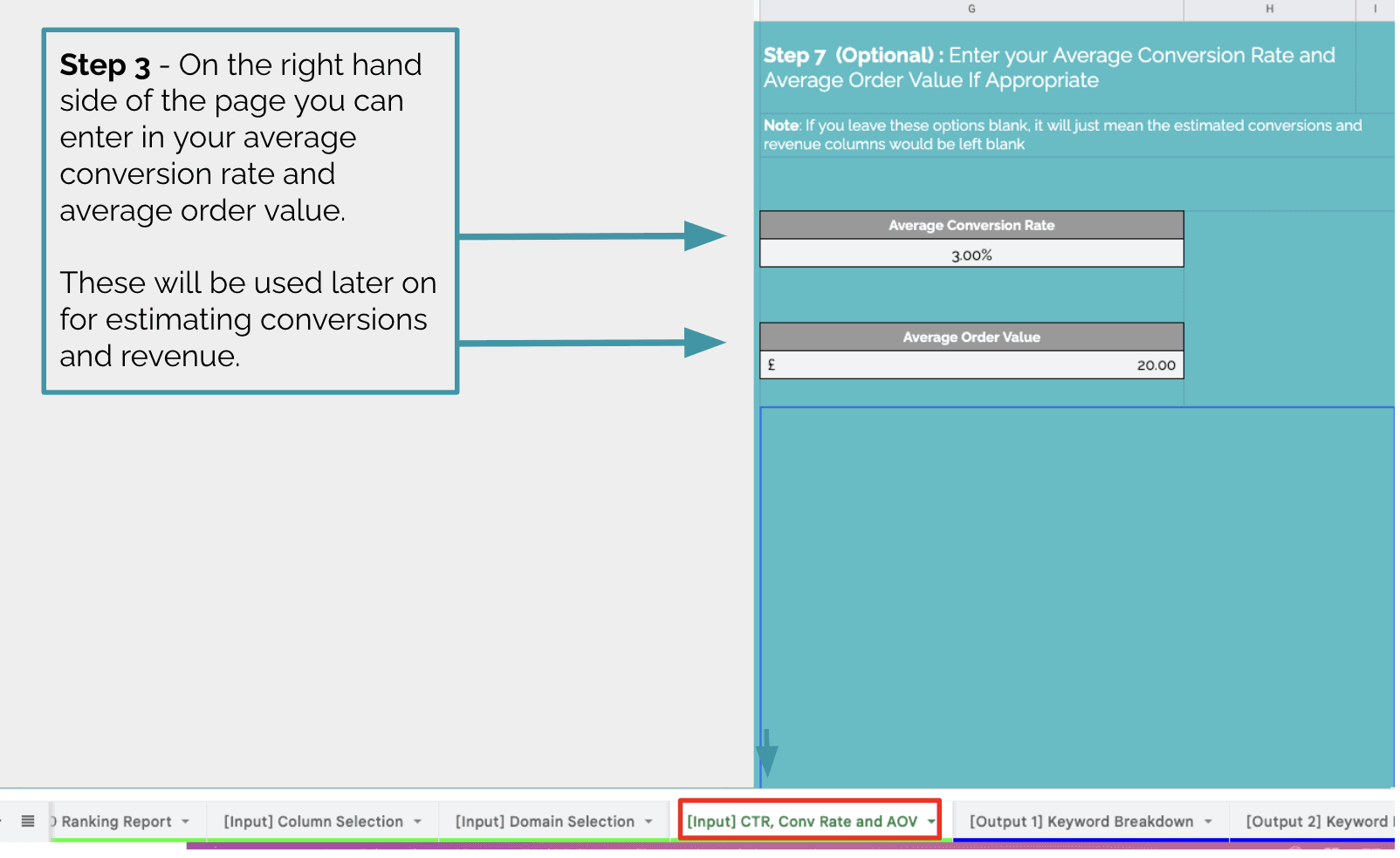 此部分旨在为您输入每个位置的估计点击率、平均转化率和平均订单价值 (AOV)。