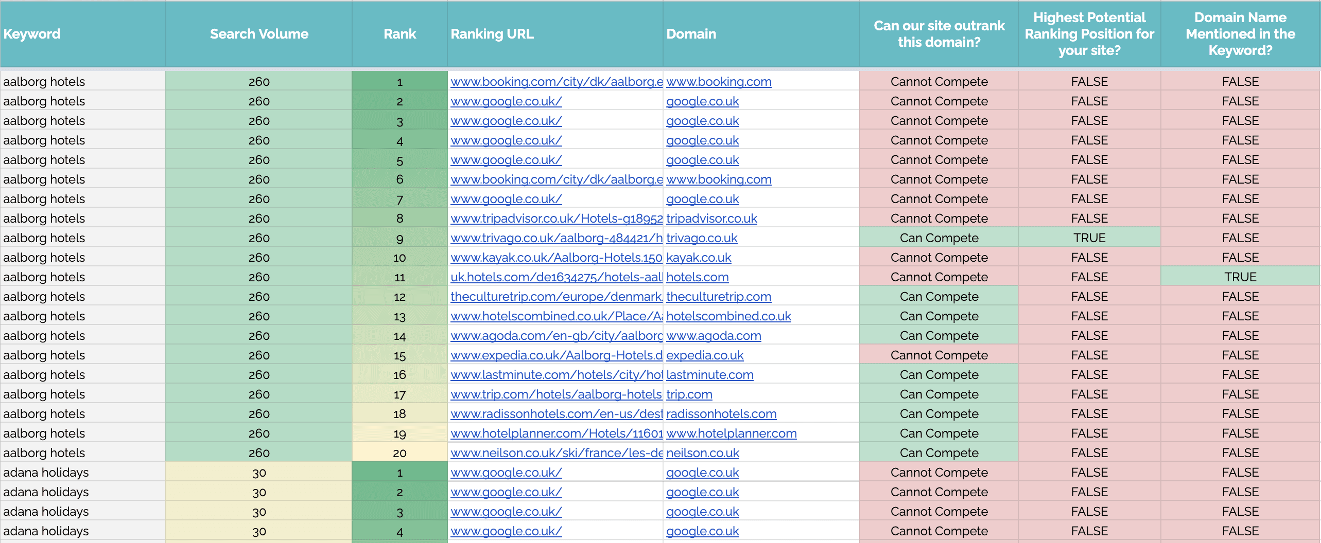 - 我们的网站的排名能否超过此域?:此列告诉您在每个域的排名位置上您是“可以竞争”还是“无法竞争”,具体取决于它们是否包含在 [输入] 域选择中的域列表中。
