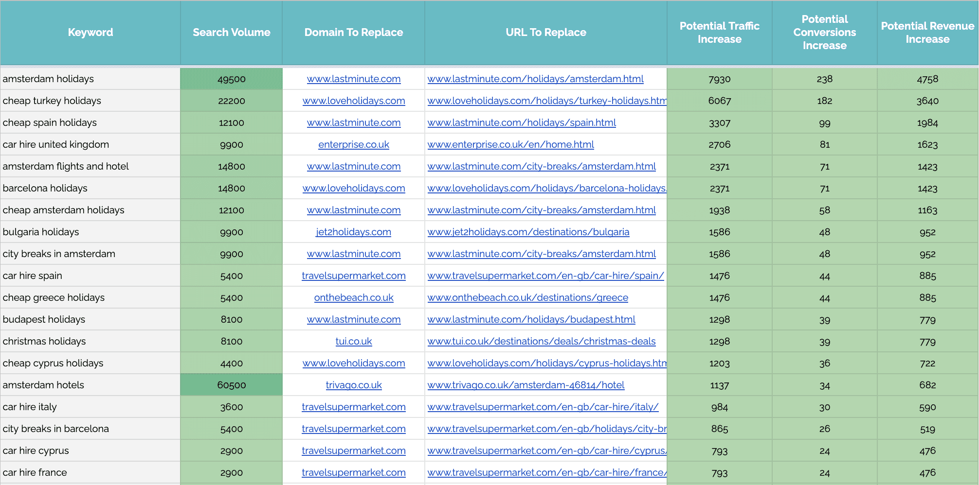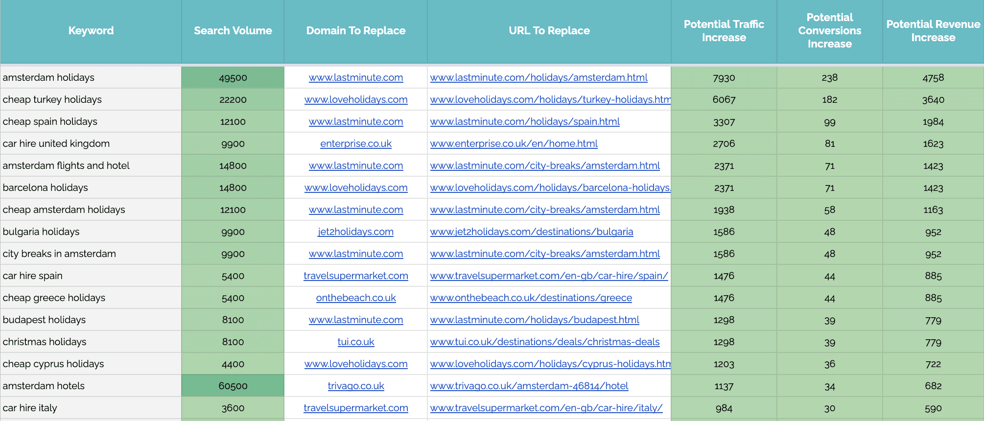 此输出提供顶级摘要,重点关注关键字、搜索量以及您可以寻求替换的域/URL。此输出中的指标侧重于潜在的额外流量、转化和收入。