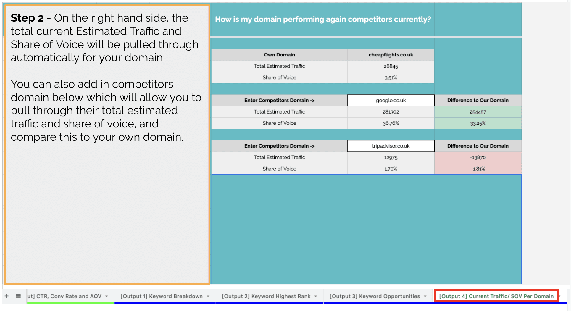 此表旨在允许您为您的优先关键字导入前 20 名排名报告,选择您认为在您的利基市场中无法超越的域,并可选择按位置、平均转化率和平均输入 CTR 数据订单价值 (AOV),如果您有权访问此数据。