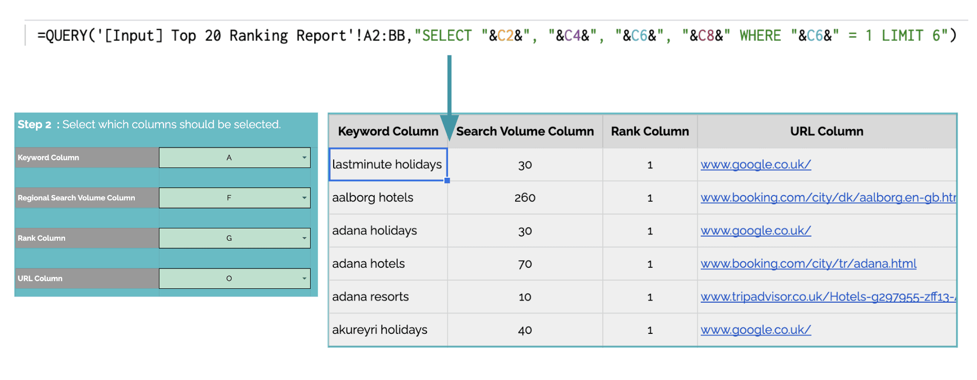 该表从排名跟踪工具获取前 20 名报告,并且: