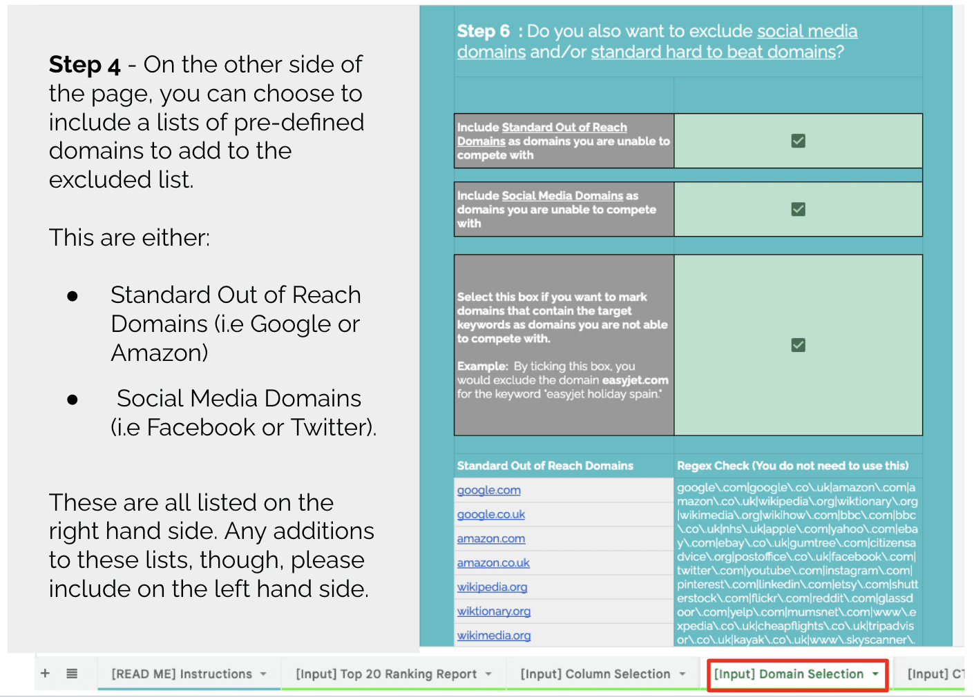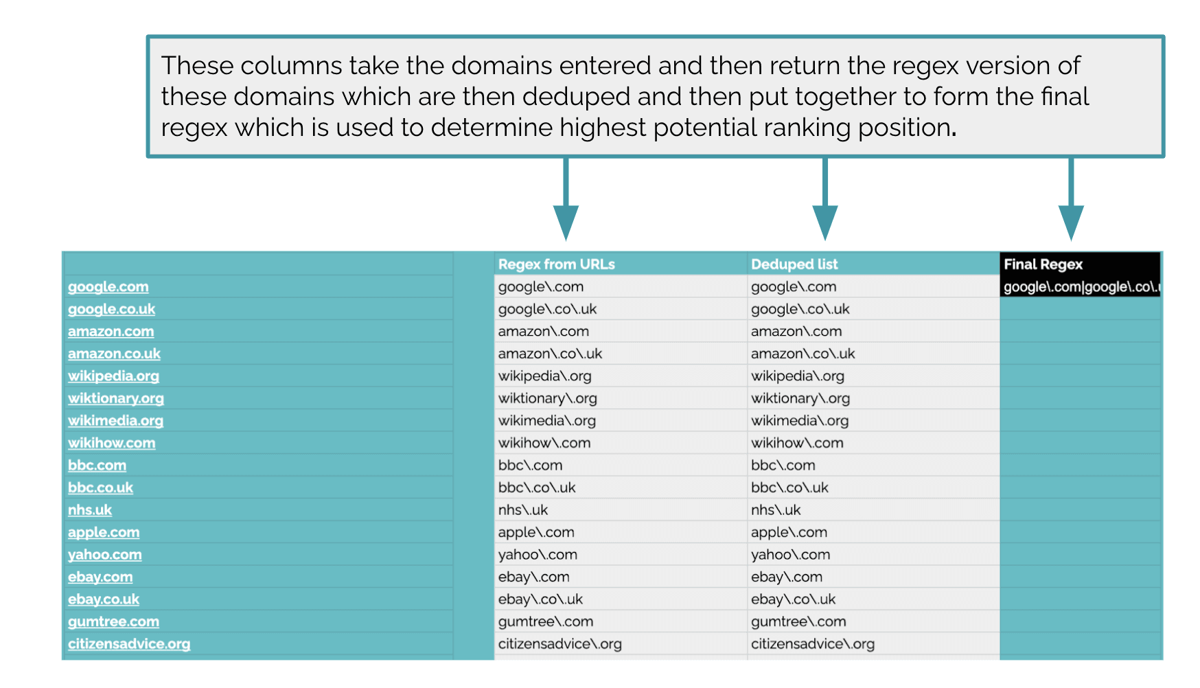 域选择使用 REGEX 将不同域的列表组合在一起,这些域在不同的输出中使用,以确定站点是否可以对特定域进行排名。