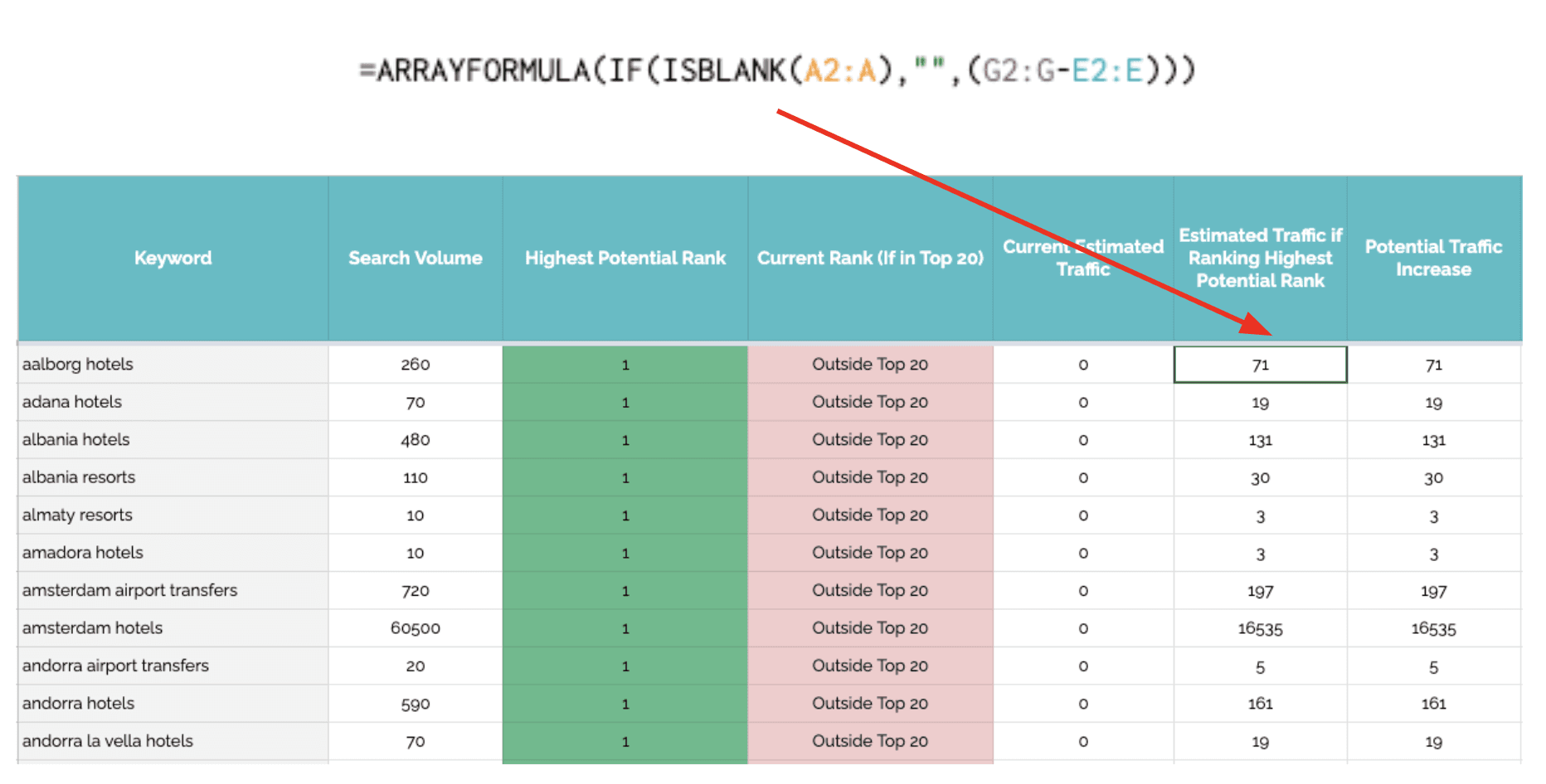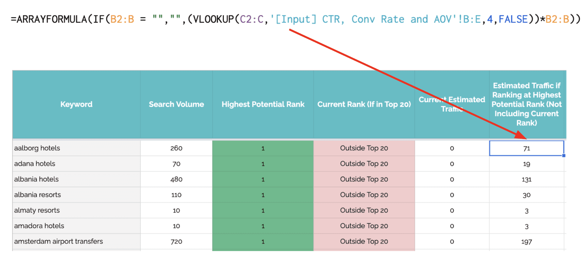通过从当前估计的流量中减去估计的流量来计算潜在位置与当前位置的差异。那里有一些额外的逻辑来捕捉当前流量是否高于潜在流量(因为我们显然不希望潜在排名低于当前排名)。