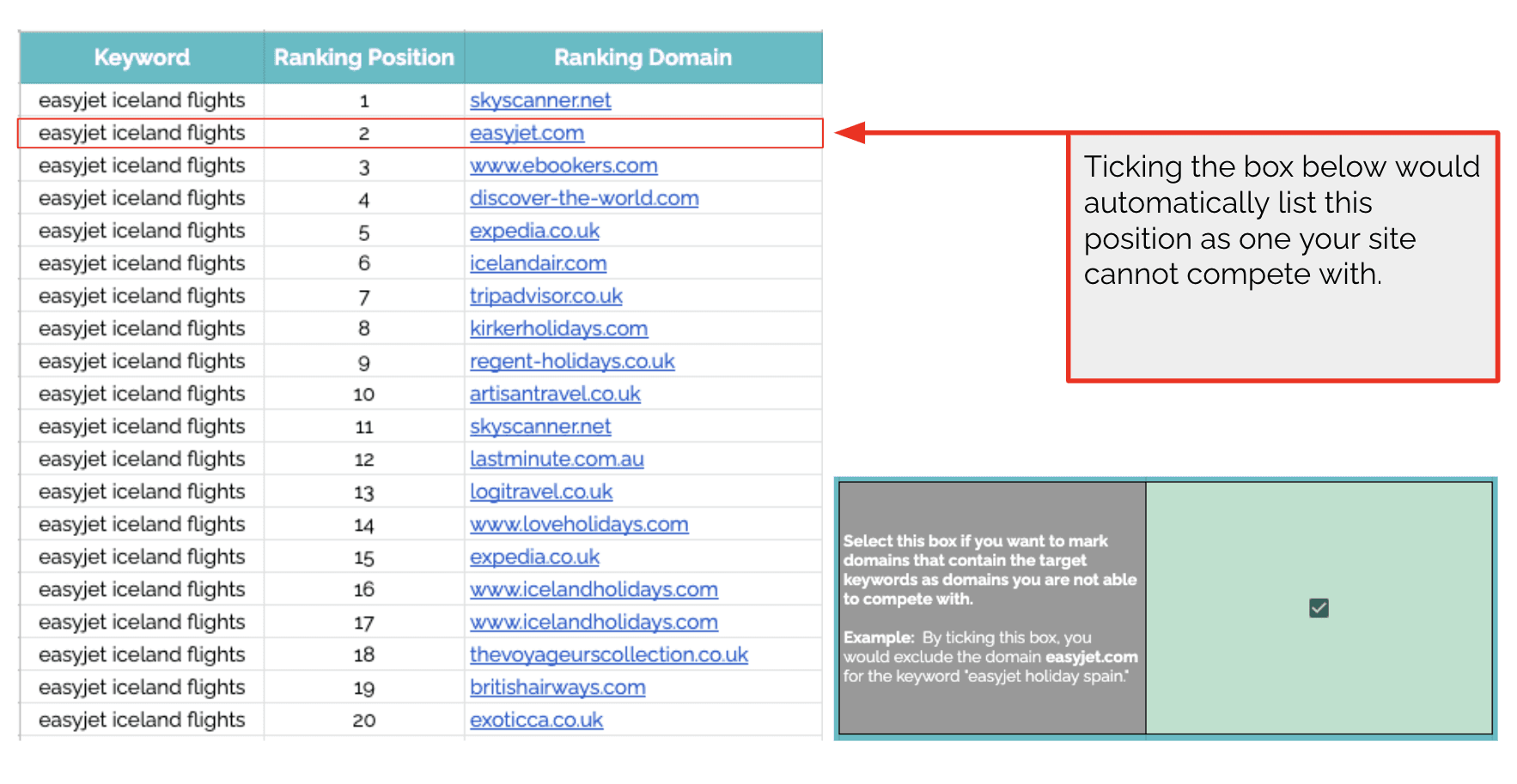 在进行关键字分析时,您可能还会意识到您的列表中有一些术语,例如“Easyjet 冰岛航班”。如果您认为您无法在“Easyjet 冰岛航班”中击败 Easyjet,您可以勾选一个框,只要 Easyjet 对包含“Easyjet”一词的搜索进行排名,该表就会自动忽略。