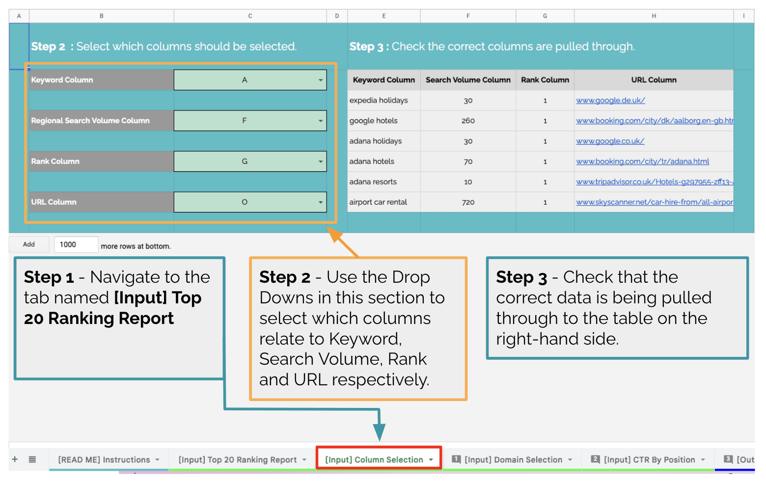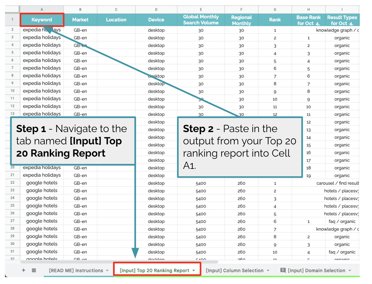 将您的前 20 名报告导入名为 [输入] 前 20 名排名报告的选项卡,粘贴到单元格 A1。您应该删除/覆盖现有的虚拟数据。前 20 名排名报告可以来自任何排名跟踪工具,例如 STAT、Rank Ranger、Accuranker、Data For SEO 等。