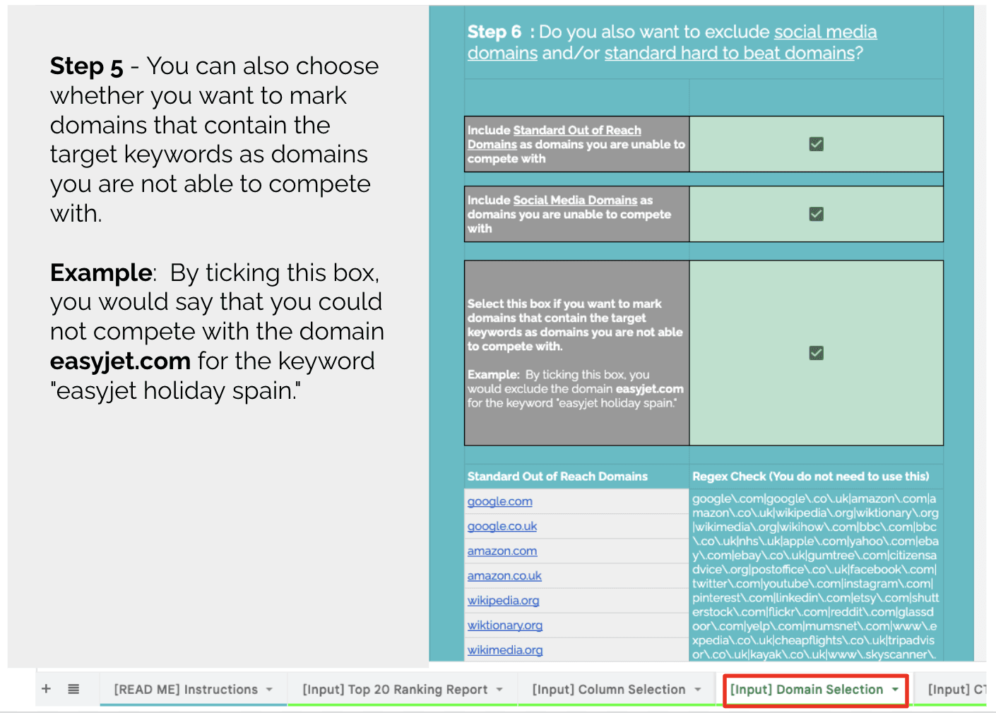 最后,您可以决定是否要排除域名中包含目标关键字的域。例如,如果您认为您无法在“Easyjet 航班”中击败 Easyjet,请勾选此框,当 Easyjet 对包含“Easyjet”一词的搜索进行排名时,该表会自动忽略。