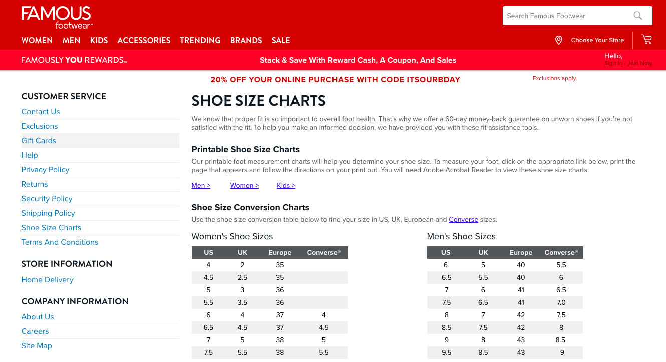 例如,我搜索了“shoe size chart”,根据 Keyword Surfer 的说法,仅在美国就有 49,500 次搜索。以下是 Famous Footwear 的最佳结果之一: