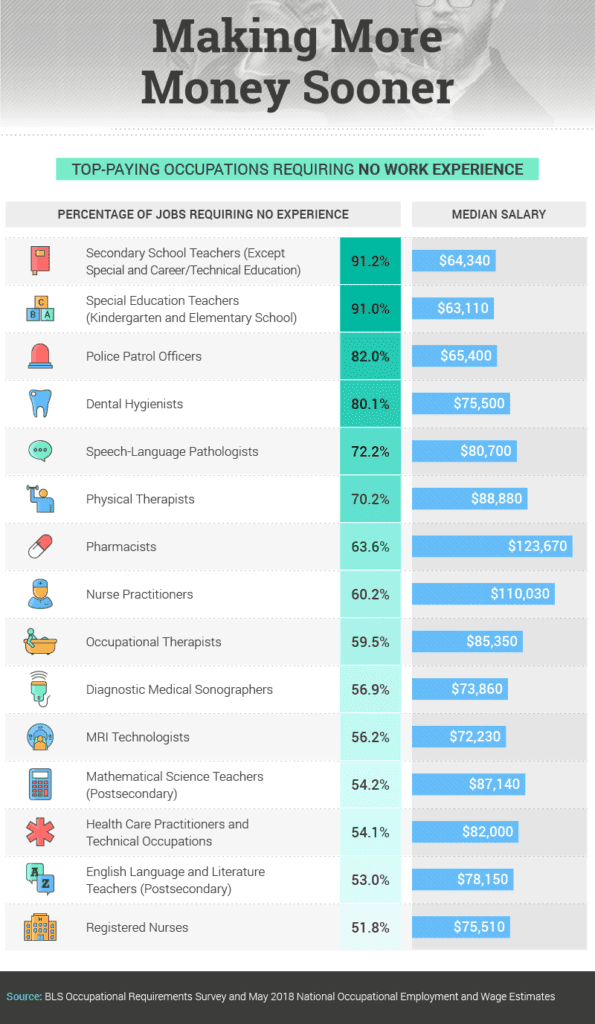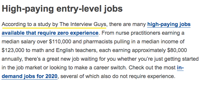 让我们以我们为 The Interview Guys 所做的一项研究为例,该研究涉及分析美国劳工统计局的职业要求调查,以确定需要最少经验的高薪工作。这是报告中的一张图表: