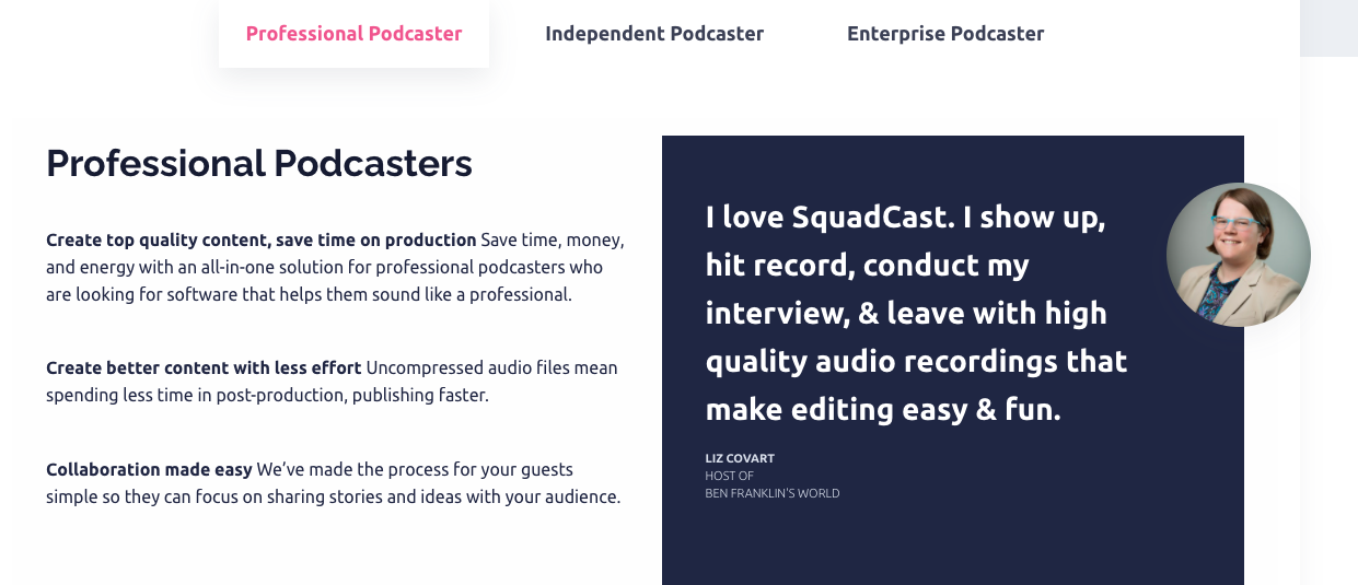 我喜欢 SquadCast 解决这个问题的方式。在他们的主页上,他们提供了一些权威信号,包括与每个用户角色相匹配的推荐信,我认为这非常聪明。