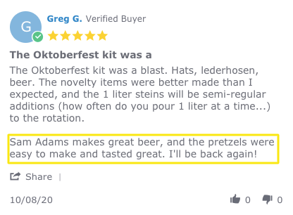 这不仅仅是一种内容策略,但您可以看到产品和构建更多体验之间的重叠。喜欢和依赖安妮阿姨椒盐卷饼的人会接触到塞缪尔·亚当斯,反之亦然。通过这样的合作,一个人的粉丝有可能成为另一个人的粉丝,正如你在这篇评论中看到的那样: