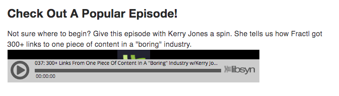 事实上,人们仍然记得 Wire 播客专家对我们之前的营销总监 Kerry Jones 的采访,她在其中介绍了我们的策略。我有营销人员告诉我,这就是他们最初听说 Fractl 的方式。多年后,它仍然出现在播客的主页上: