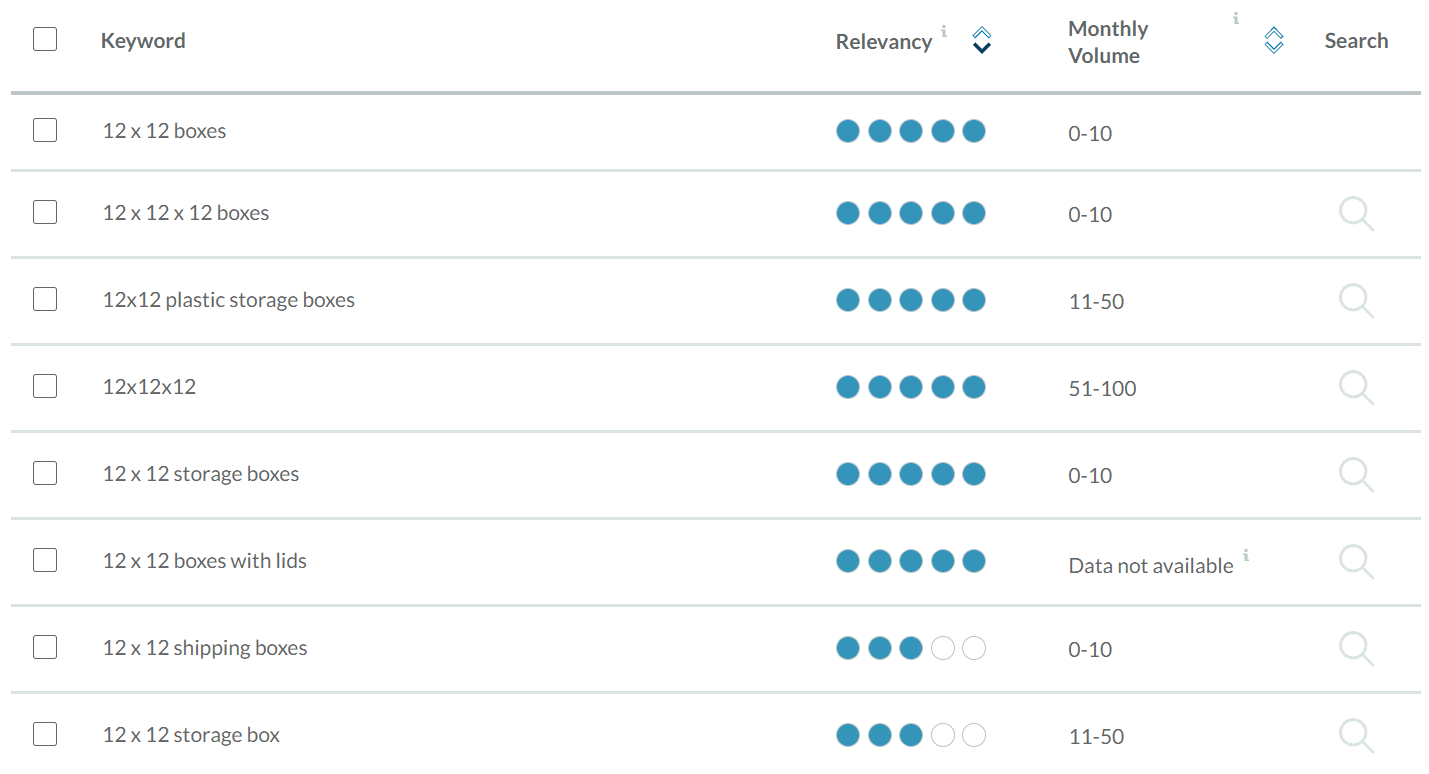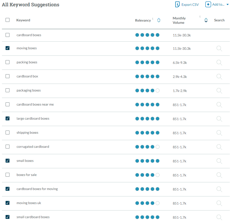 那么,以纸板箱作为我们的初始种子关键词,我们还能发现哪些其他相关关键词呢?使用关键字资源管理器的关键字建议,我们可以立即了解一些高度相关且搜索良好的相关关键字。