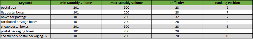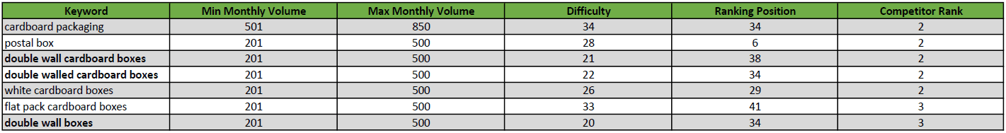 在关键字资源管理器中搜索您的网站将返回包含您的排名位置的关键字列表。然后,您可以将其导出到 excel 并过滤您想要定位的关键字。在我们的案例中,让我们看看我们客户的网站在与纸板箱相关的术语中的排名。
