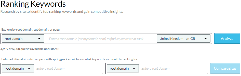 关键词研究最重要的部分可能是检查您的竞争对手在哪些方面排名良好,但您不是。您可以在关键字资源管理器中执行此操作,只需在按网站搜索时添加一个或两个域到您的搜索: