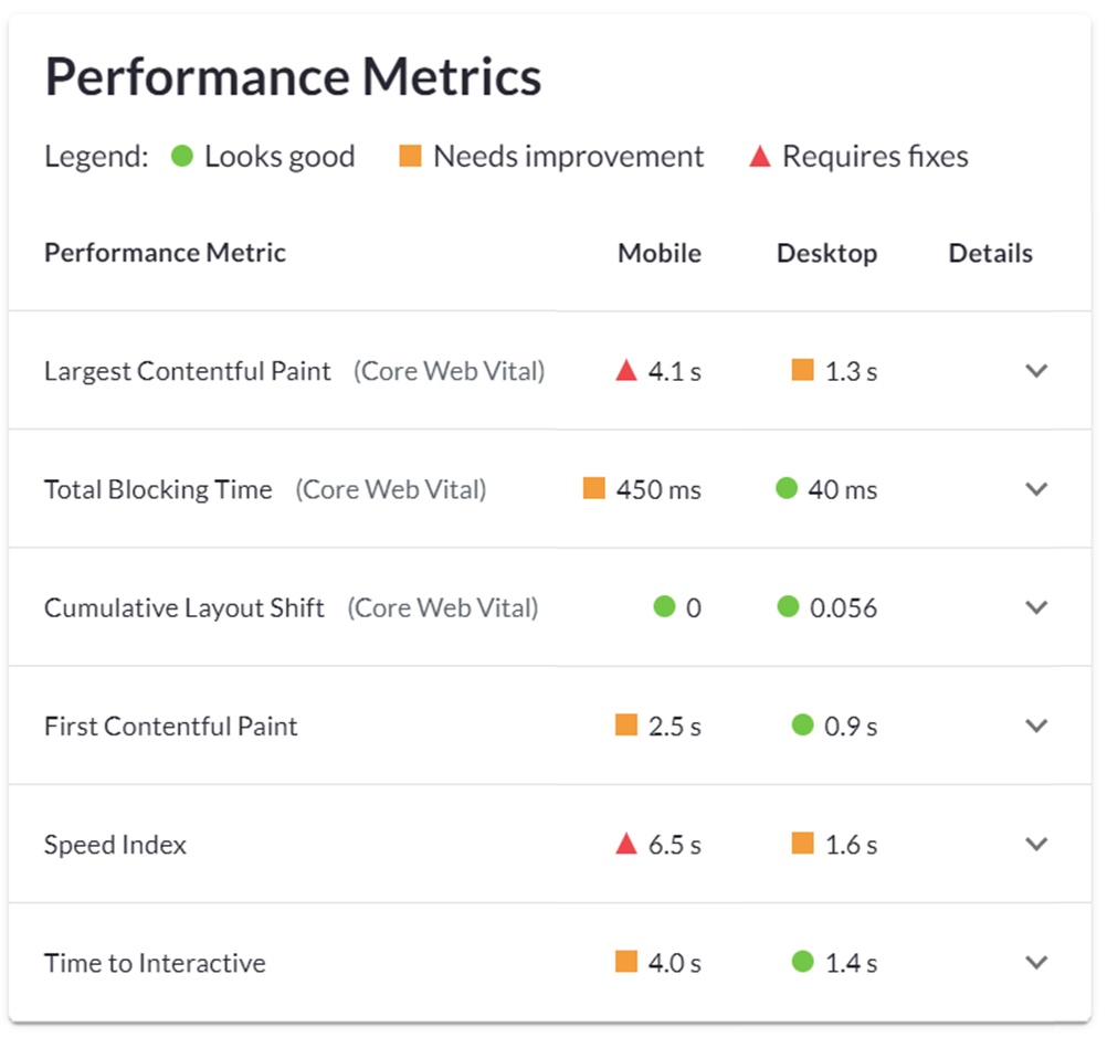 这些指标都可以扩展,以提供有关每个指标的更多上下文,以及什么被认为是好或坏的分数: