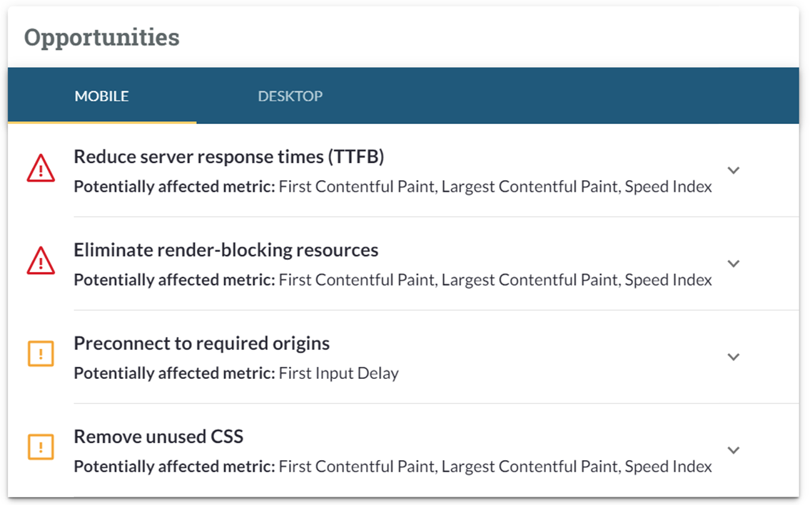 可以对这些数据进行过滤和排序。每行中的“详细信息”下拉箭头突出显示该 URL 的关键建议修复,快速浏览。