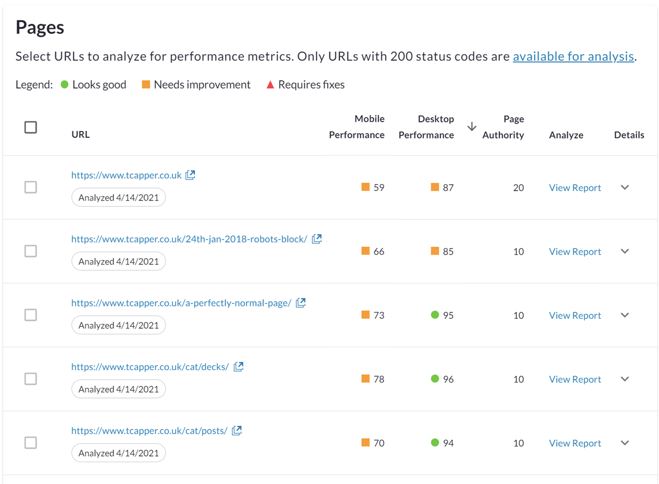 如果您单击“查看报告”,您可以查看每个 URL 的更多详细信息: