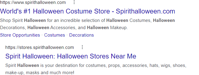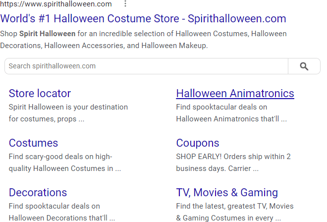 只是为了让生活变得混乱,缩进的结果与扩展的附加链接(排名第一的位置)不同,例如搜索“Spirit Halloween”时的这些: