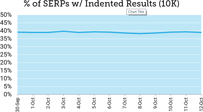 在我们目前拥有数据的 13 天里,MozCast 中第一页谷歌 SERP 的缩进结果的流行率一直稳定在 40% 左右。由于我们经常看到新功能以个位数的百分比推出,这是一个重大的发展。