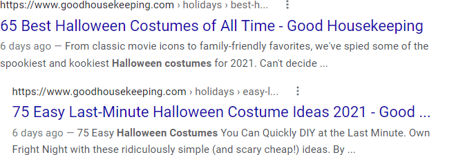 最近,经过数月的测试,谷歌全面推出了缩进结果。这些是来自同一域的有机结果组,例如搜索“万圣节商店”的结果: