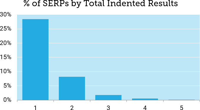 一个域最多可以显示三个缩进结果,并且多个域可以在任何给定的 SERP 上具有缩进结果(尽管在第一页上很少见)。在我们的数据集中,以下是按结果计数的细分: