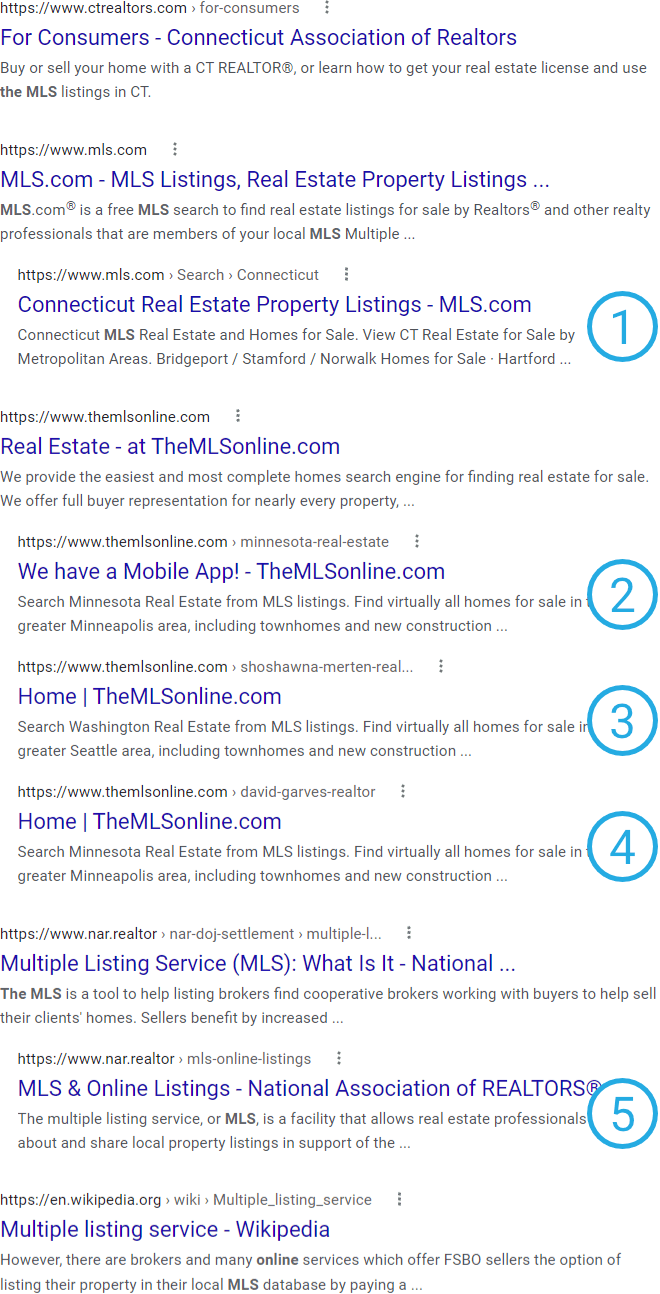虽然这是一个类似品牌的搜索,但多个网站都在 MLS 数据库中出现,而且它们似乎都不是官方的,这让谷歌有点进退两难。有趣的是,第三个域有三个缩进的结果。请注意,此页面上的总有机结果(常规 + 缩进)仍为 10。