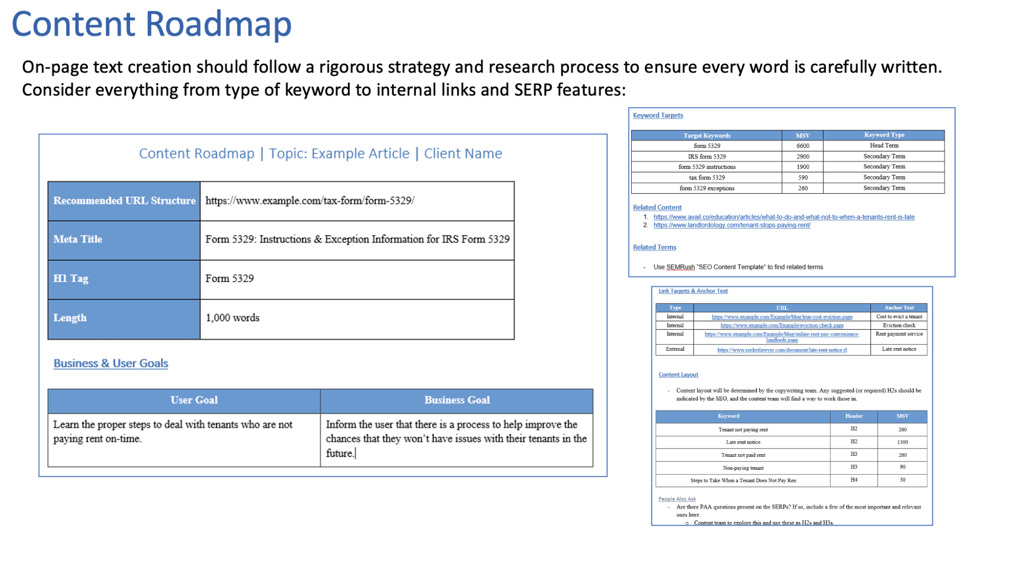我们建议创建内容地图以帮助指导内容团队。这些路线图应包含文案撰写者了解如何为谷歌搜索引擎优化写作所需的一切。