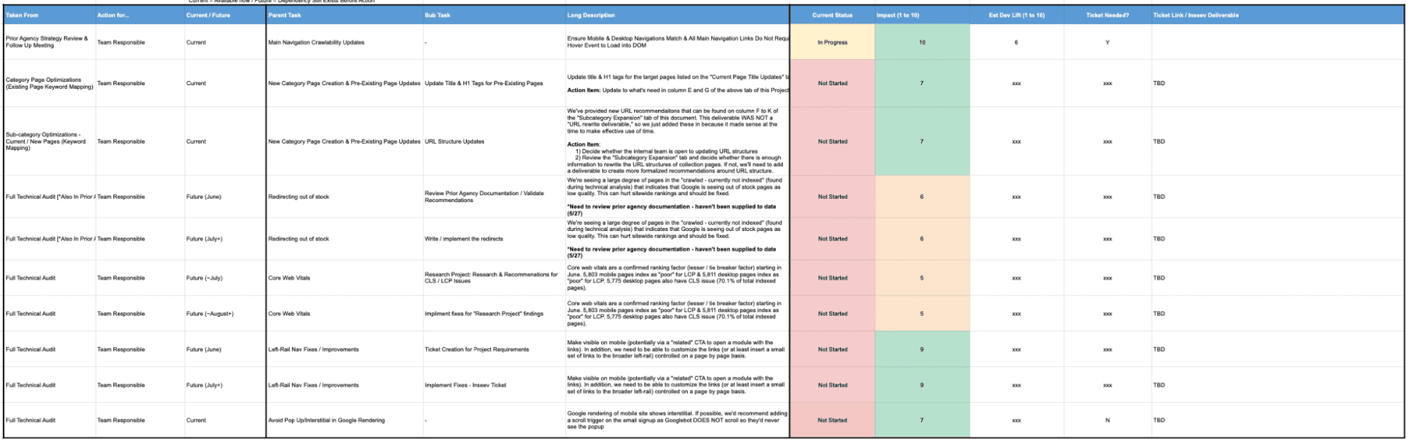 提示 #2:创建问责制跟踪器。无论您是顾问、内部 google SEO 还是代理合作伙伴,“下一步行动”或项目跟踪器有时是不够的。我们创建了一个问责制跟踪器,我们可以每周讨论项目落入其他团队时的位置,特别是涉及到许多不同方向的工程团队。