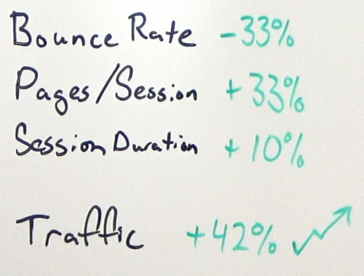 我们还在页面上添加了一张图片以引起对链接的注意。跳出率立即下降了 33%。为什么?人们正在点击链接。他们想检查他们的域权限。每个会话的页面增加了 33%。所以当人们访问这个页面时,他们访问的页面更多,因为这个链接和随附的图像。